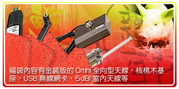 福袋內容有金裝版的Omni全向型天線,核桃木基座,USB無線網卡,5dBi室內天線等,通通有獎,過年才有的機會,敬請把握。為了公平起見,以訂單順序決定福袋編號