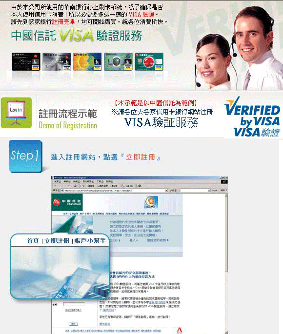 『VISA驗證』服務是一項嶄新的安全服務,當您使用您的VISA卡進行網路購物時,可搭配一組個人密碼,以確保只有您才能使用您的VISA卡。其註冊過程十分簡易,並且您得以免費享有這項服務。