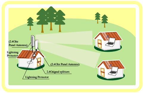 圖示所裝設之無線區域分享,是從甲地傳輸訊號至兩個不同方向的乙、丙地,天線零配件如下:甲地須架設指向性天線PA、避雷器、N male to RP SMA male、分享器,乙地及丙地只要用notebook做接收即可,但須要加外掛增益天線,接收訊號會比較強,如果不外加高增益天線可能傳送距離會比較近。