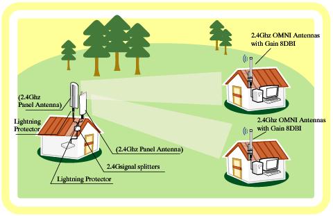 以下圖示為另外一種裝設方式都可以針對你的需求來架設,乙地及丙地可以在加外增益天線全向性及指向性天線,這樣的接收品質會更好。