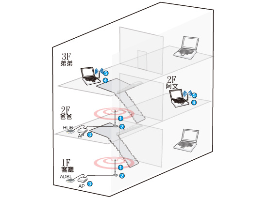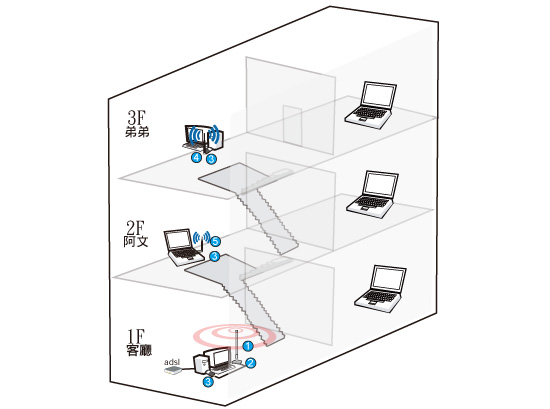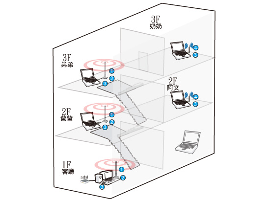 | 自家已有ADSL網路,想要全家都能無線上網 | | 一般的家庭目前普遍都已有ADSL寬頻網路可上網,但是都受限於需要在有數據機的房間內接上網路線才行,或是又把網路線接上集線器在拉網路線到各房間才能上網使用。拉線不方便而已不美觀。 安裝無線網路才能讓樓上房間或是樓下的客廳都能無拘束地上網! 假設:如果家中的格局和圖中的建築物是差不多的環境,隔局為一前一後中間是樓梯, 樓層平面全長距離為20公尺,每層的樓高約為3公尺,建築物約為三四層樓高度。 家中只需放一二組的全向08dBi增益天線+USB無線網卡,無線訊號幾乎全家就都可以有訊號了。三樓的部份再用室內5dBi的小天線基座組+USB無線網卡來加強接收訊號。 |