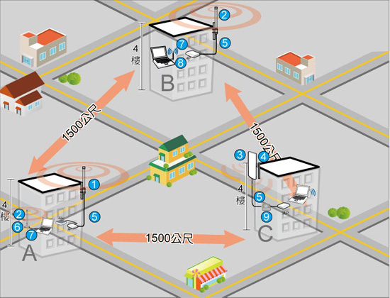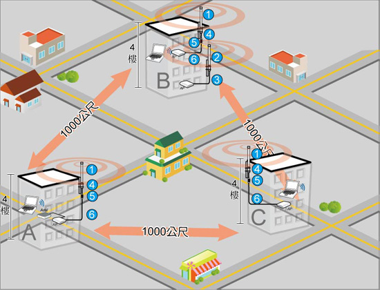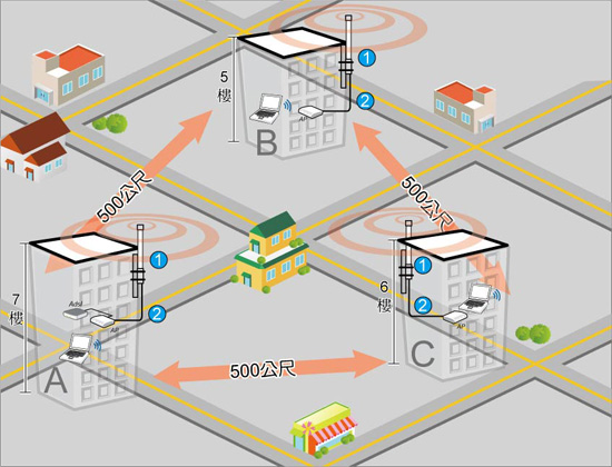 多點的無線環境架設,不管在地勢落差或是環境遮蔽物上,都會比架設二點的訊號對傳時, 需要更注意增益天線的訊號角度範圍跟環境的安裝考量。例如: 全向增益天線的水平訊號角度皆為360°①,垂直訊號角度則為6°~15°②。 指向平板增益天線的水平訊號角度為15°~75° ③,垂直訊號角度為16°~38° ④。(備註) 不同形式的增益天線在針對不同的環境跟需求時,造成的訊號效果都會有差別。 一般來說,多點訊號架設在範圍小距離短的環境,選擇增益天線就以廣角度的增益天線為主, 相對,若範圍上各點的距離比較遠,可同時選擇全向增益跟指向增益天線搭配,依序中繼訊號延伸。