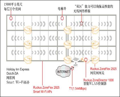 在實際應用中,Holiday Inn Express的每一層都安裝了一台單獨的ZoneFlex 2925作為“根AP”。然後他們在根AP的覆蓋區邊緣,安裝Ruckus ZoneFlex Lite Mesh網關產品(LMG)。根AP與LMG形成了獨創的革命性“輕型網狀網”結構,解決了傳統的無線AP所需要的以太網接口缺失的問題。在這種結構下,每一台ZoneFlex LMG既是無線中繼器也是一台AP,被設置為聯系根AP,並雙向重複廣播信號。一旦某一台根AP出現故障,ZoneFlex LMG會自動的重新聯系另一台根AP,從而讓它的用戶可以繼續正常使用網絡。通過在ZoneFlex 2925根AP的正反兩端各部署2台ZoneFlex LMG,整層大約15000平方英尺,30個房間的區域,就全部被無線網絡信號覆蓋了。