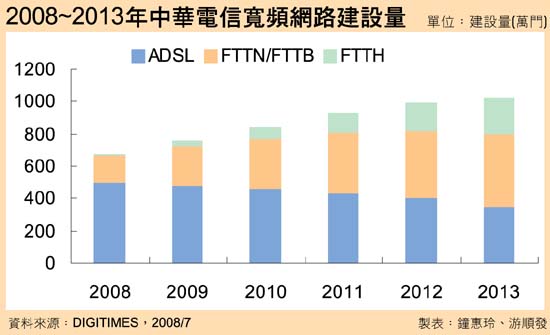 到2013年時,中華電信估計其ADSL建設量只會剩下350萬埠,而FTTN/FTTB與FTTH的建設量分別達到近450萬埠與近225萬埠,屆時FTTx的涵蓋率可達83%。