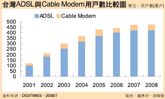 台灣的有線電視業者切入Cable Modem業務已經多年,但是與電信業的ADSL服務相比,一直無法大舉擴增市場規模。根據NCC的統計,到2008年3月底為止,Cable Modem帳號數為53.5萬,xDSL用戶數則有421萬,雖然前者與2007年12月底的情形相較,帳號數成長率有6.6%,而xDSL則是衰退0.1%,不過總體客戶基礎差距仍大。