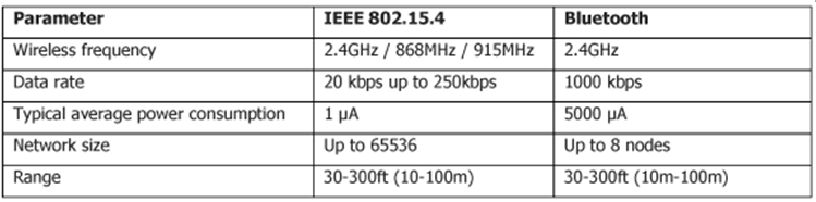 表1列舉了IEEE 802.15.4標準的主要參數並與藍牙進行了比較。