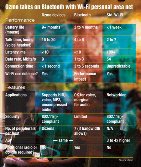 新創公司Ozmo日前發表一款晶片及其配套軟體,並聲稱該Wi-Fi晶片比藍牙技術更能為無線週邊設備提供高頻寬與更長的電池壽命,但成本卻更低。該公司目前正與英特爾進行合作,而英特爾也正在探索其迅馳(Centrino)筆記型電腦於Wi-Fi PAN領域的市場潛力。