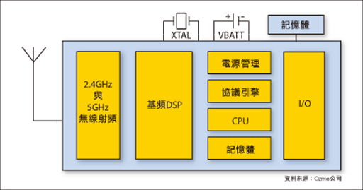 圖說:Ozmo公司精簡型的雙波段802.11晶片能支援10公尺的傳輸距離,而價格與藍牙晶片相當。